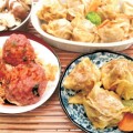 (1)牛肉和豬肉洗淨切成小肉丁(從超市買現成的絞肉亦可),放入大的容器中,加入鹽攪勻。生粉加入1,000cc水攪拌至看不見乾粉,成為粉漿。